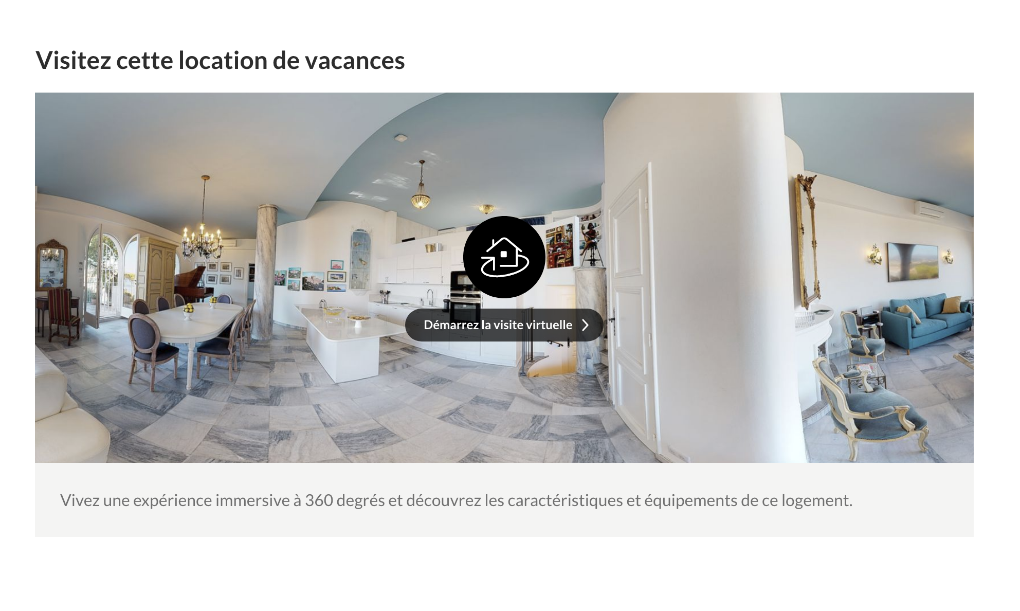 Les espaces indépendants (garage, chalet, appartement annexe, etc.) sont intégrés sous forme de photos panoramiques à 360°.